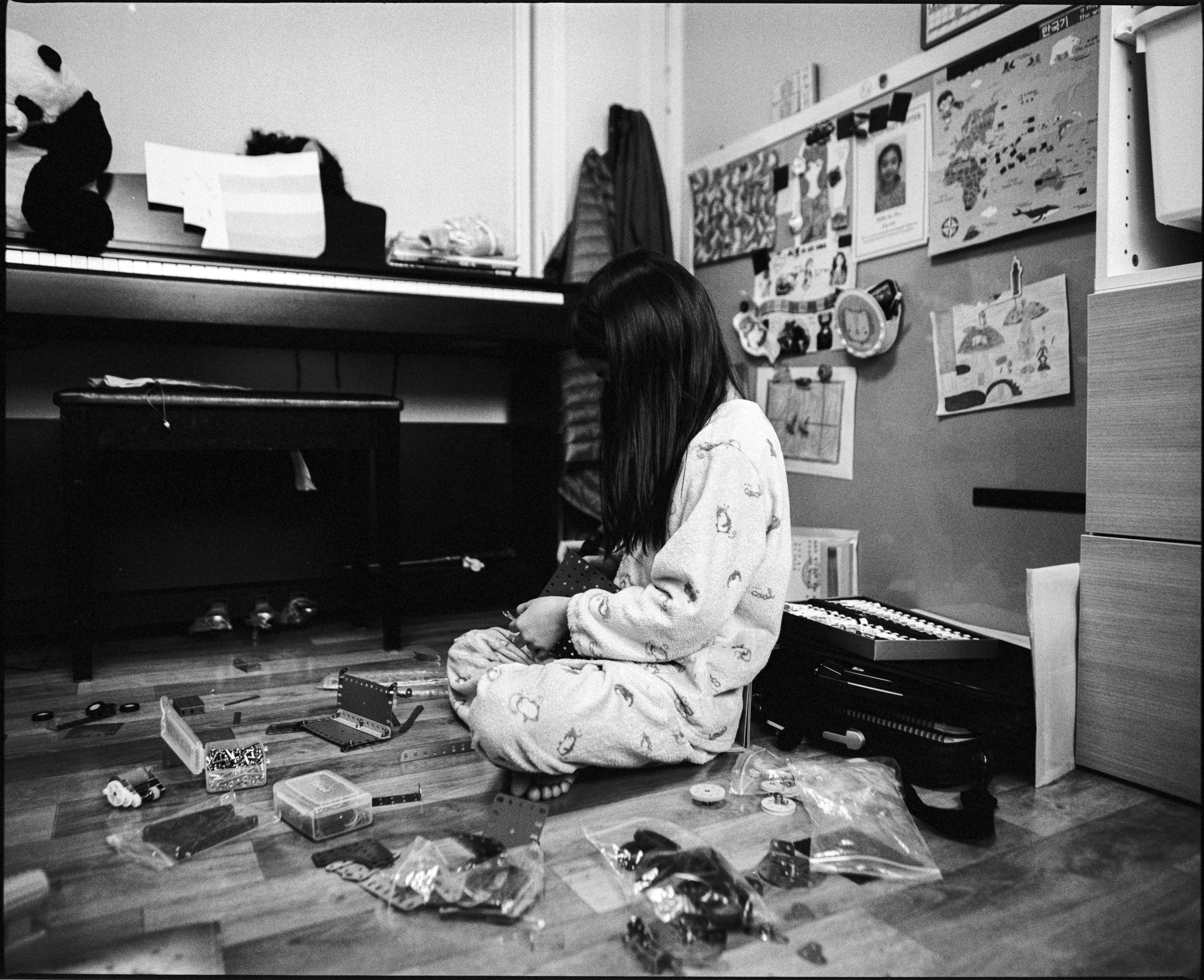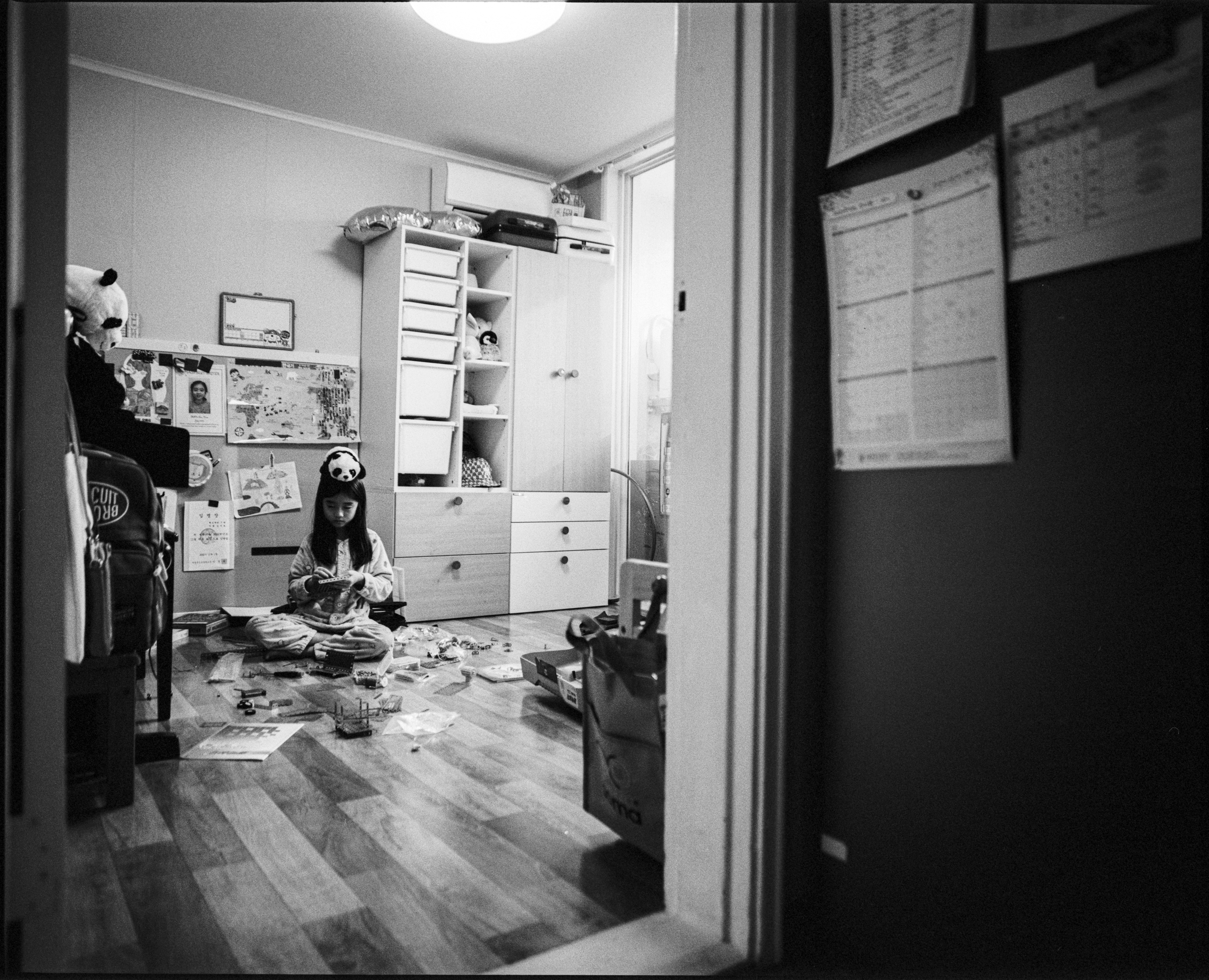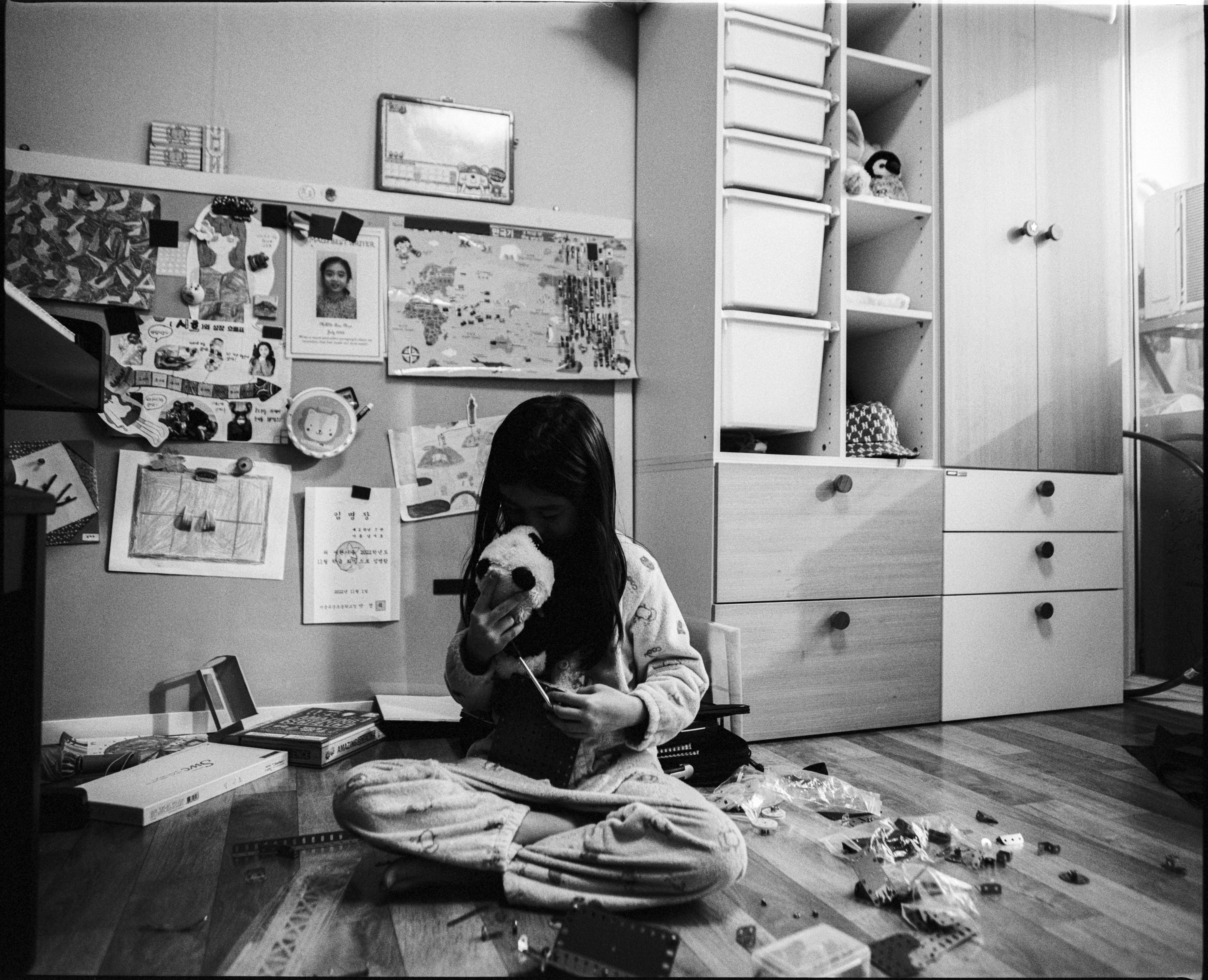 제가 아주 애정하는 중형 카메라인 마미야 RZ67로 담은 일상 기록 사진입니다. 이번에 사용한 50mm 렌즈는 35mm 환산기준 25mm 정도의 넓은 화각이라 좁은 방안에서 아이를 관찰하고 담기에 최적의 화각이 아닐까 생각됩니다.