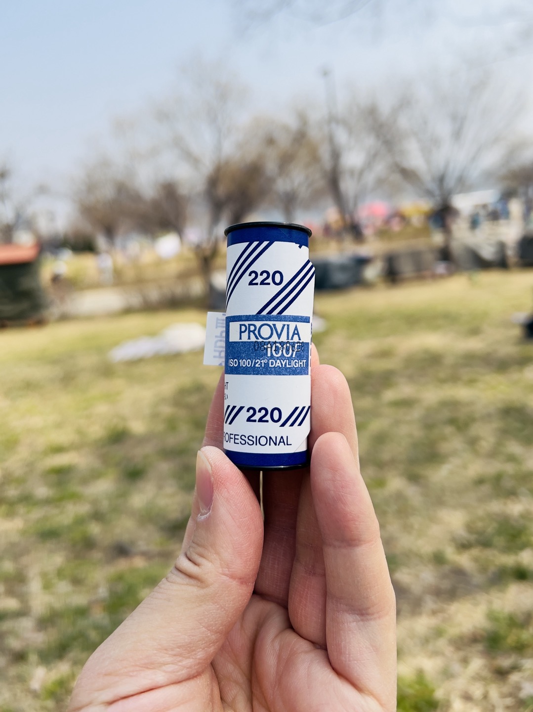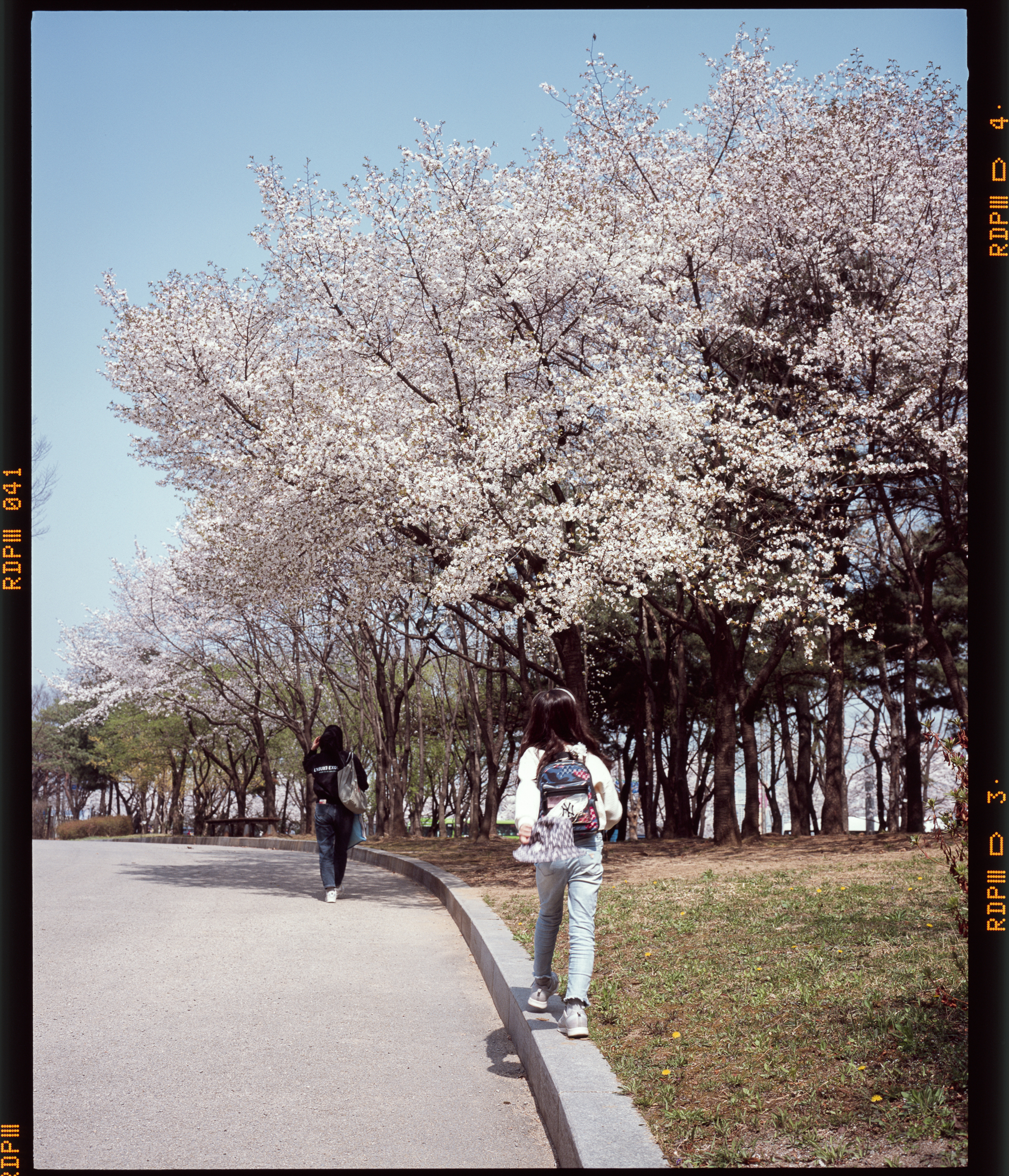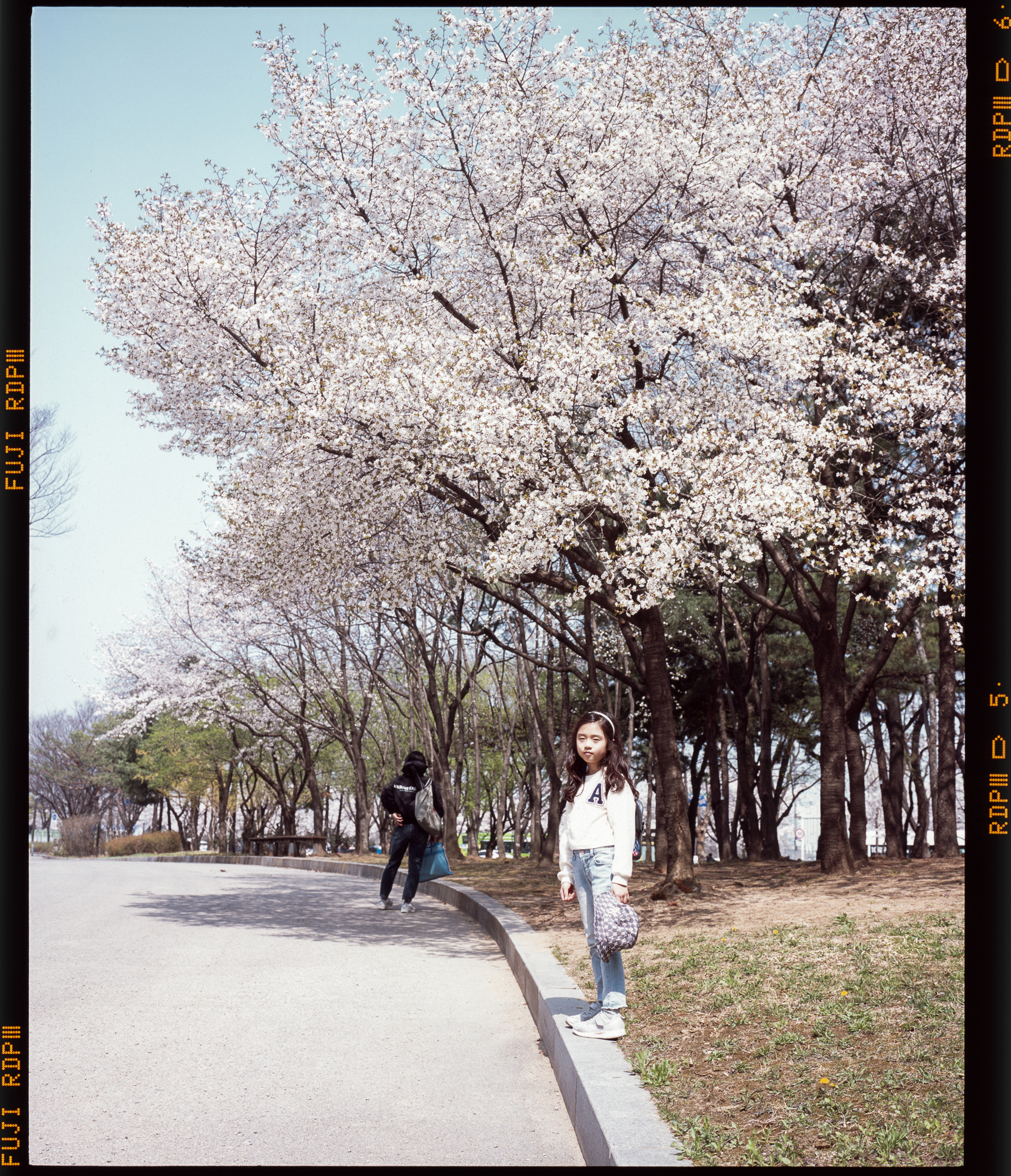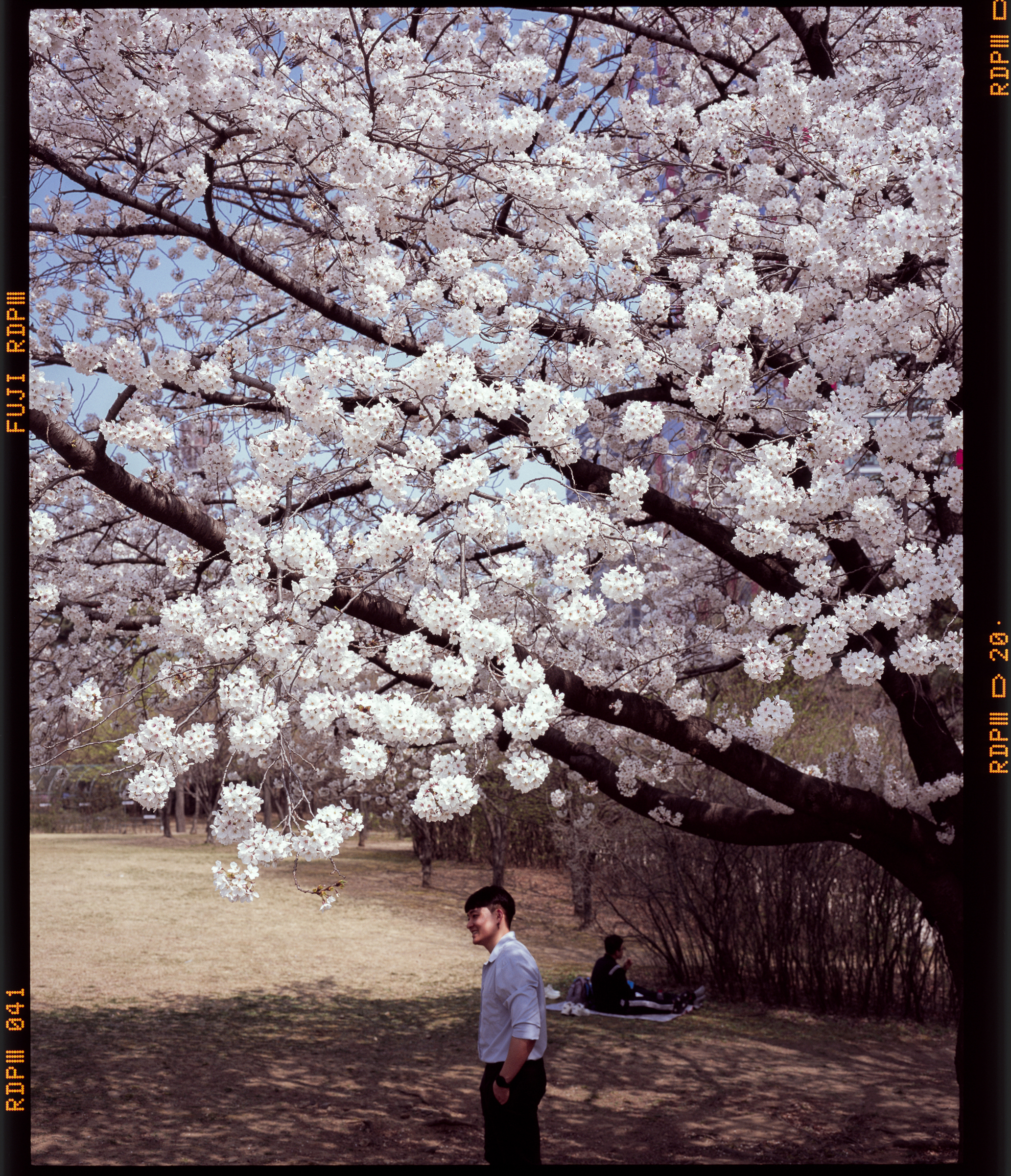 2023년 봄, 벚꽃 피크닉 사진의 하이라이트 정도 될까... 기대했지만 이게 또 생각보다 마음에 들지는 않습니다. 생각보다 밝게 나왔어요. 황사가 조금 있어서 파란 하늘이 쨍하진 않았지만 측광을 너무 정직하게 했던 것이 원인인 것 같습니다. 하지만 또 이 프로비아 필름은 인물에도 너무 좋아서 언더 촬영하면 피부톤이 확 죽어버리는 단점도 있어 딜레마이기도 합니다.