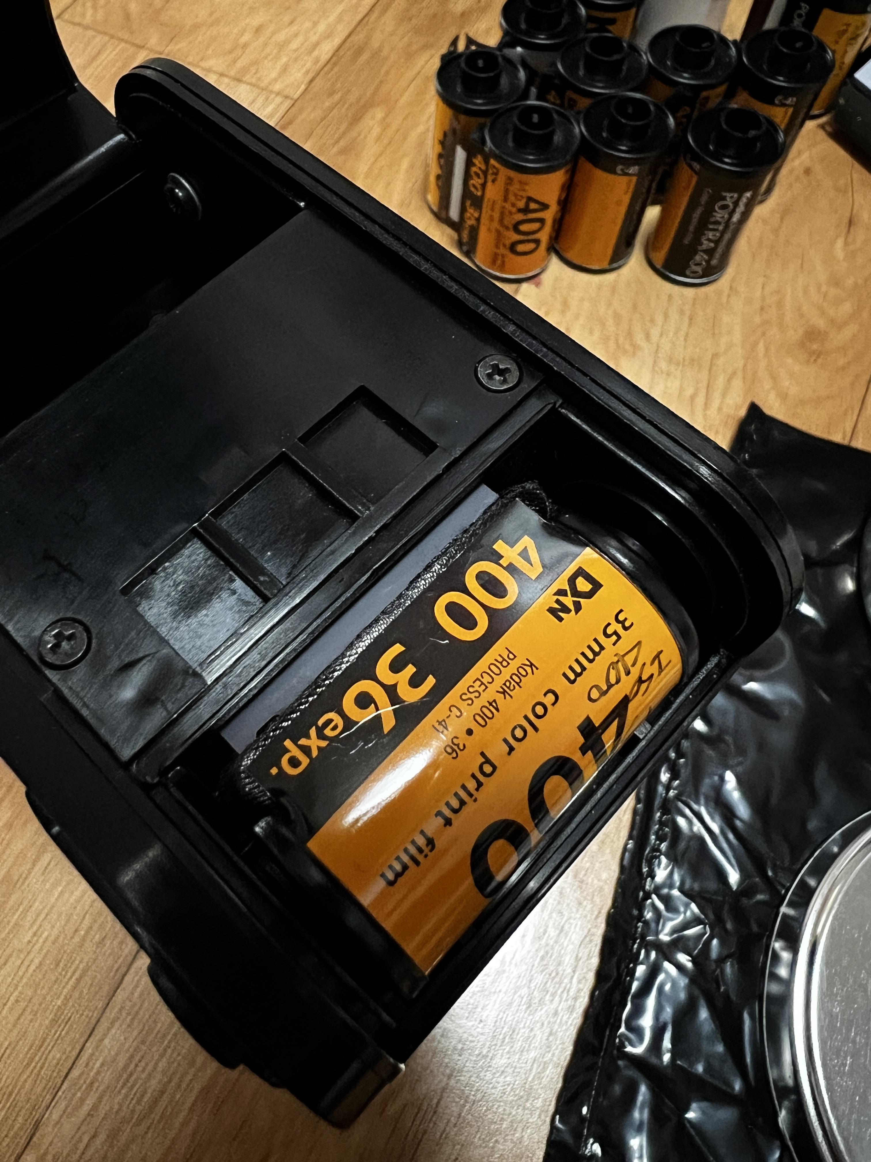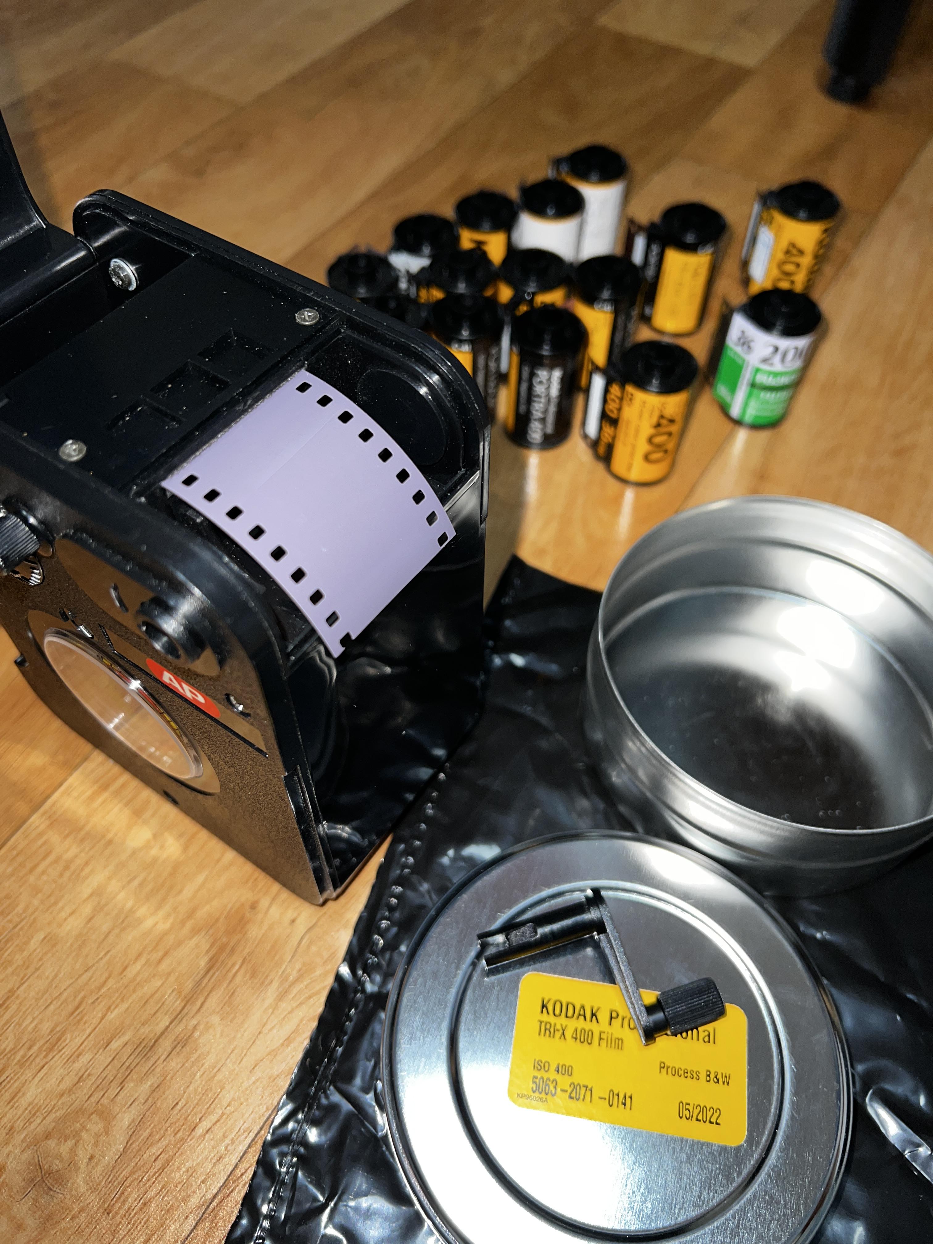 주의점1. 로더기는 상판뚜껑을 열거나 닫아도 상관 없지만 와인딩 레버를 넣은 채 필름 롤을 넣어야 합니다. 처음에 시도할 때 로더기 뚜껑도 열고 레버도 안 끼운체 암백에서 작업했는데, 제대로 로더기 입구쪽에 필름이 물리지 않았습니다. 로더기 몸통에 와인딩 레버를 넣은 상태여야 하고, 필름 끝을 로더기 내부 입구에 살짝 걸쳤다고 판단되면, 필름 롤을 로더기 중심에 잘 맞추어 끼워 넣은다음, 동그란 필름실 뚜껑을 돌려서 닫으면 됩니다. 그 후에 암백 밖으로 꺼낸 다음 로더기 상단 가운데 동그란 레버를 살살 돌리면 필름이 조금씩 바깥으로 나오게 됩니다.